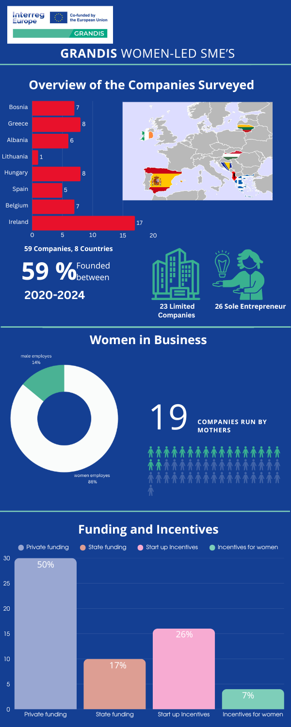 A DDRIÜ, mint a GRANDIS projekt konzorciumi vezetője, a többi projekt partnerrel együtt nemrégiben közzé tette a nők által vezetett kis-és középvállalkozásokkal (KKV) kapcsolatos új megállapításait a partnerországok helyzetének felmérése részeként. Az eredmények mind a 8 európai partnerország – Bosznia-Hercegovina, Görögország, Albánia, Litvánia, Spanyolország, Belgium, Írország és Magyarország – 59 vállalatának önkéntes részvételén alapulnak.