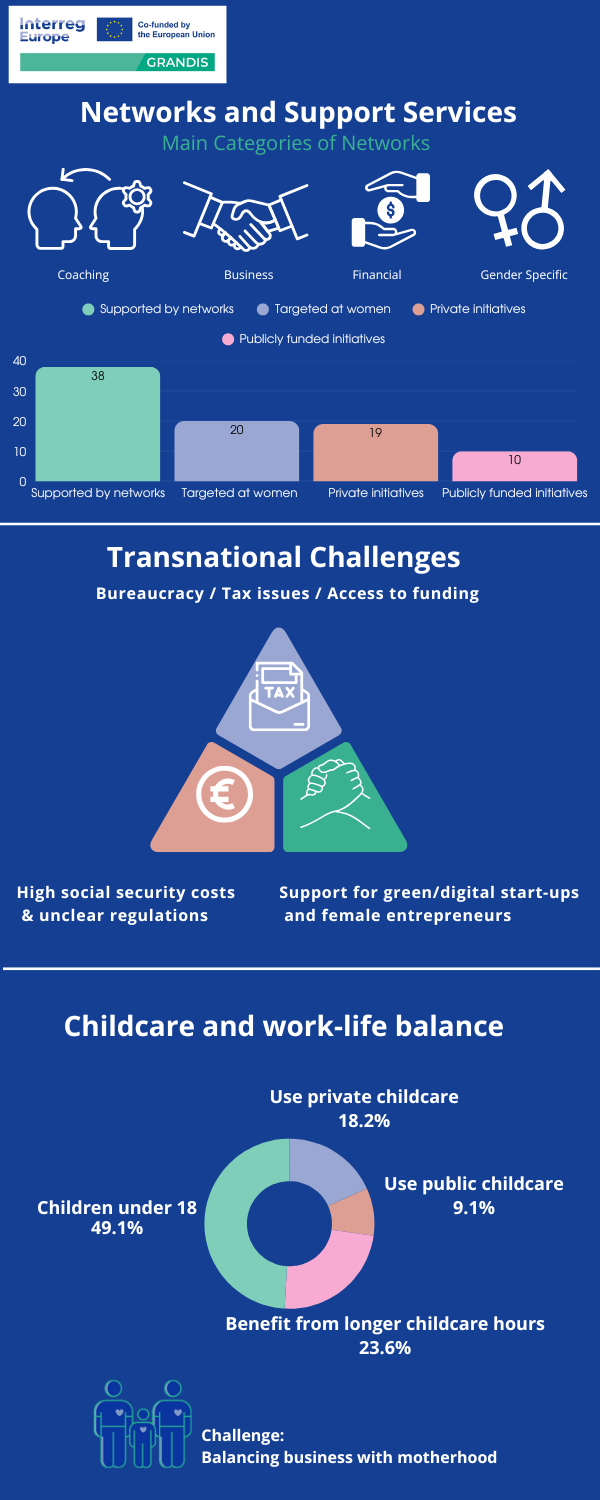 • Az 59 vállalatból 38 azt állította, hogy kapnak támogatást hálózatokon (networks) keresztül (úm. coaching, pénzügyi vagy üzleti támogatás, illetve női hálózatok), de ezeknek csak körülbelül 1/3-a célozta meg kifejezetten a nőket, és csak 10 volt államilag finanszírozott kezdeményezés. Az országok közötti megoszlást tekintve Litvániában van a legtöbb elérhető támogató hálózat (9), míg Magyarországon a második legtöbb, 3 kezdeményezéssel.