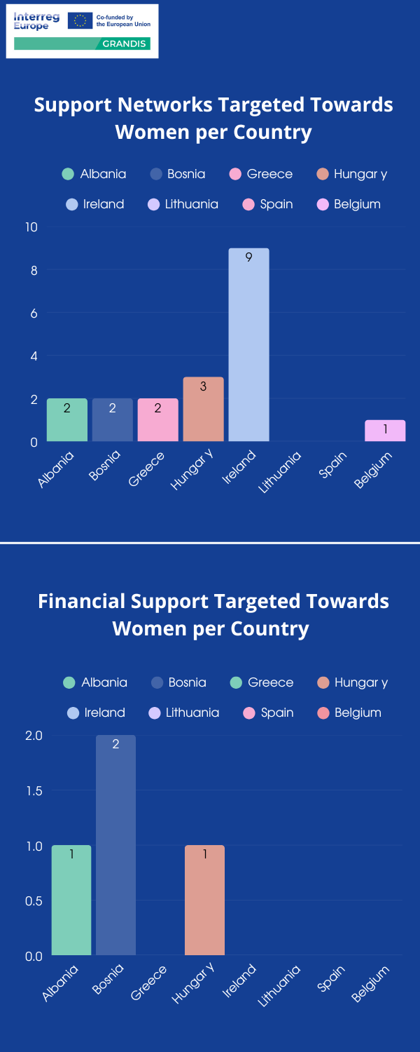 • A női vállalkozók számára elérhető pénzügyi támogatások és ösztönzők nagy része magánfinanszírozás (50%) vagy induló vállalkozásoknak szóló ösztönzők (26%). A kifejezetten nőknek szóló finanszírozás terén is egyértelműen hiány mutatkozik, a 8 országból összesen 4 esetet azonosítottak Magyarországon, Albániában és Boszniában.