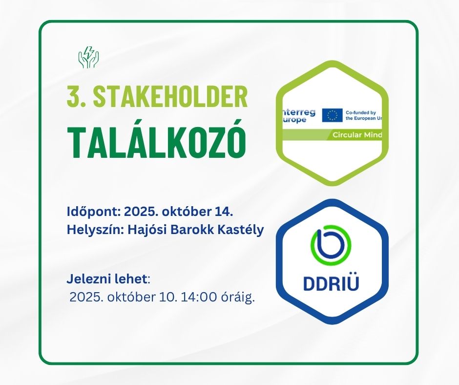 A Dél-Dunántúli Regionális Innovációs Ügynökség Nonprofit Kft. (DDRIÜ Nonprofit Kft.) a Circular Minds Interreg Europe projekt résztvevő partnereként ezúton meghív minden érdeklődőt a projekt harmadik helyi stakeholder találkozójára. A projekt a körforgásos(köz)beszerzések szélesebb körű alkalmazását törekszik elősegíteni, elsősorban szemléletformálással, illetve a szervezeti tanulás előmozdításával. A stakeholder találkozót (local stakeholder table meeting) 2025. október 14-én kedden, a Közép-Duna Menti Fejlesztési Ügynökség Nonprofit Kft. (KDMFÜ) által szervezett konferencia keretében tartjuk meg, délután 14:30-16:30 óra között, a Hajósi Barokk Kastélyban.