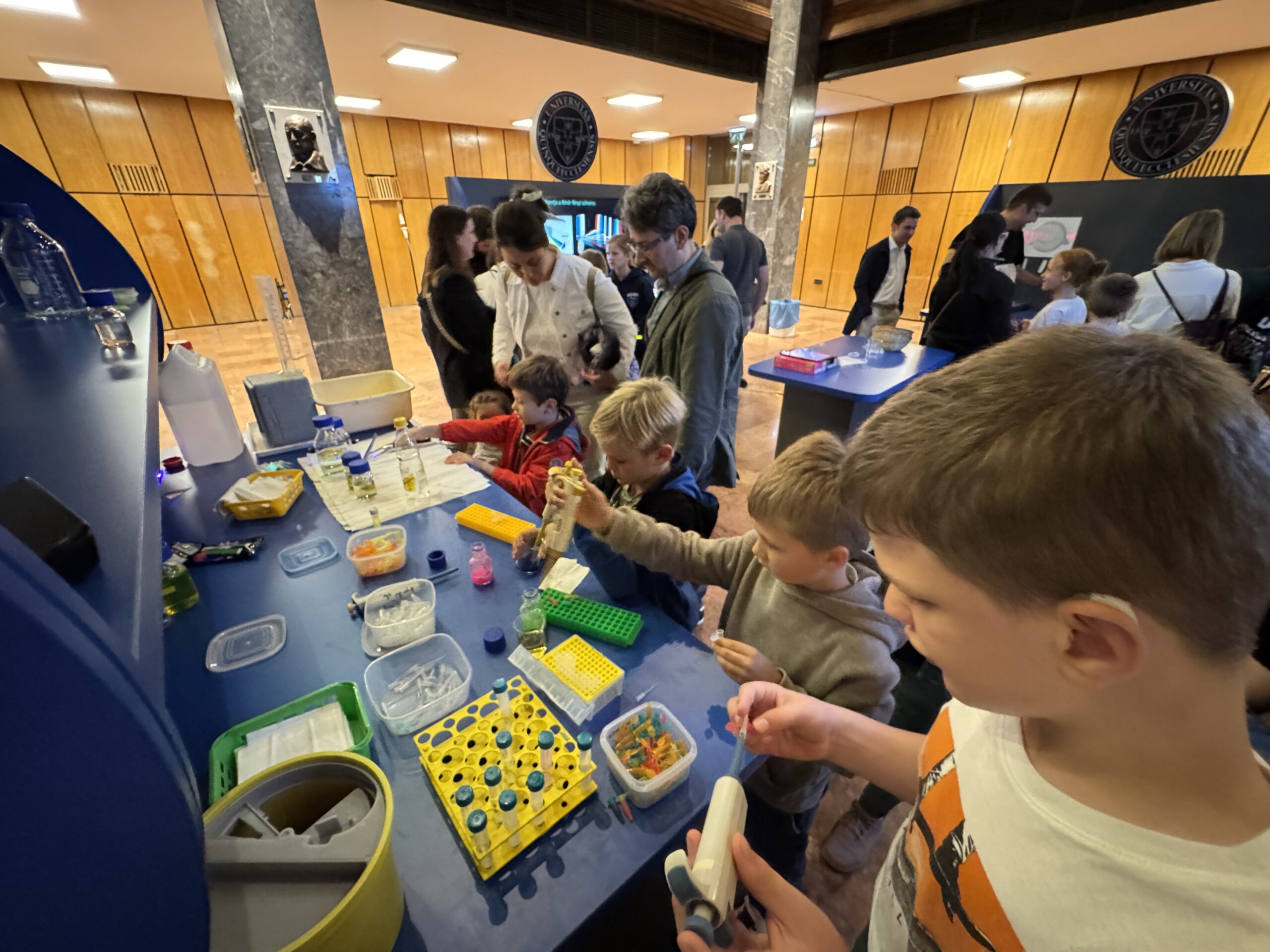 A teljesség igénye nélkül az alábbi pár fotót mellékeljük a 2022-2025 között megrendezett Kutatók Éjszakájáiról. A felvételek a Általános Orvostudományi Kar aulájában készültek.