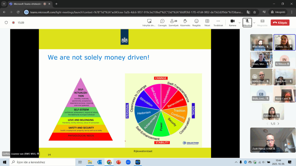 Az előadást Lisanne van Geffen tartotta a holland Rijkswaterstaat (Infrastruktúra és Vízgazdálkodási Minisztérium) megbízásából, a Delfti Műszaki Egyetem képviseletében. A megbeszélésen húszan vettek részt, zömében a Circular Minds projekt Partnerei és stakeholderei.