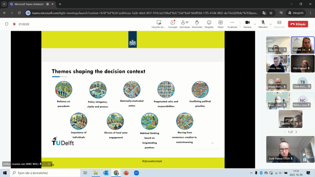 Az előadást Lisanne van Geffen tartotta a holland Rijkswaterstaat (Infrastruktúra és Vízgazdálkodási Minisztérium) megbízásából, a Delfti Műszaki Egyetem képviseletében. A megbeszélésen húszan vettek részt, zömében a Circular Minds projekt Partnerei és stakeholderei.